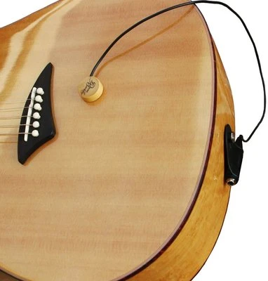 Piezo transducer amplifier for acoustic guitars. Easy to use patented wood design provides great dynamics and detail. Easy to attach and remove. Long-lasting adhesive won’t damage your guitar’s finish. The result is a dynamic natural-sounding amplifier. The 24‘‘ cable terminates with a female 1/4 ‘‘ jack that connects to your guitar‘s strap button.
