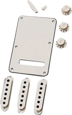 Accessory Kit designed for Stratocaster Fender guitars. It contains volume and tone control knobs, pickup switch tip, tremolo arm tip, tremolo backplate and pickup covers. Pickup covers do not fit SCNâ„¢, N3â„¢ and Noiselessâ„¢ pickups.