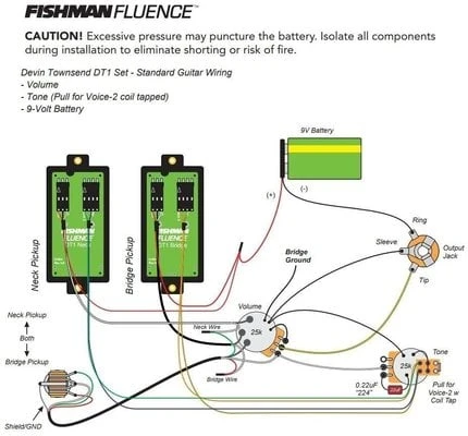 Active pickup set for electric guitar – Devin Townsend signature model from Fishman. Each Fishman Fluence pickup has two distinct and useful sounds on-board. These sounds start with the revolutionary Fluence Core, the heart of Fluence tone. From this Fluence Core we then create the classic timbres and tone — colors you expect from great guitar pickups — as well as some you’ve never expected.