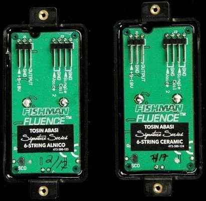 Pickup-set – Tosin Abasi signature series for 6-strings electric guitar from Fishman. The Tosin Abasi Signature Set is unique in the way it makes multiple coil combinations available, in conjunction with the different voices. Even the magnetic circuit is tuned, with pole pieces and a blade magnet combined in the neck position for authentic single coil interaction. For neck and bridge, Voice 1 begins with our Modern recipe and fattens up the low midrange while adjusting the output level to Tosin’s taste. Voice 2 is bright and clean, with extremely fast and detailed top end for percussive attack and crystalline cleans. In the bridge, Voice 2 is a classic rock and hard rock tone that melts into any rig or mix. The cutting midrange of an overwound ‘bucker with the glassy highs of a vintage P.A.F. Then, the single coil modes each have their own unique Voice. The neck pickup reminiscent of a vintage Tele, and the bridge pickup focusing on the quacky Strat-like “2 and 4” tones.