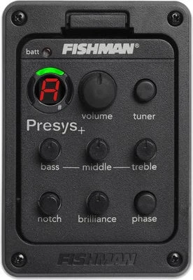 The onboard preamp system is designed to offer maximum control, performance and quality in a small, unobtrusive format. The compact sophisticated Presys+ system features Volume, Bass, Mid and Treble controls, a Phase switch, and a built-in tuner with LED display. The Presys+ preamp also includes a pre-wired Fishman Sonicore pickup for solder-free, plug and play installation, as well as a low battery indicator, low profile control knobs, and a unique pivot design for easy access to the battery compartment.