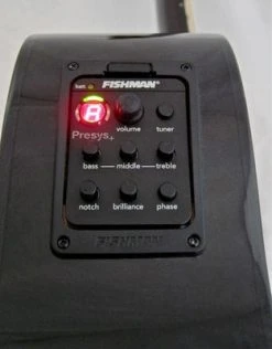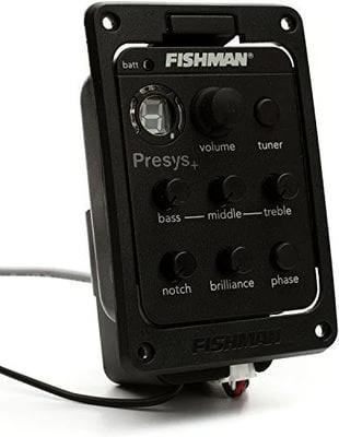 Sophisticated onboard preamp system for electro-acoustic guitar that is designed to offer maximum control, performance and quality in a small, unobtrusive format. It features Volume, Bass, Mid and Treble controls, a Phase switch, an onboard anti-feedback control (notch), a Brilliance control for additional tone shaping and a built-in tuner with LED display. It also includes a pre-wired Fishman Sonicore pickup for solder-free, plug and play installation, as well as a low battery indicator, low profile control knobs, and a unique pivot design for easy access to the 9V battery compartment. Battery life: 88 hours. Dimensions: 55.8 x 84.2 mm.