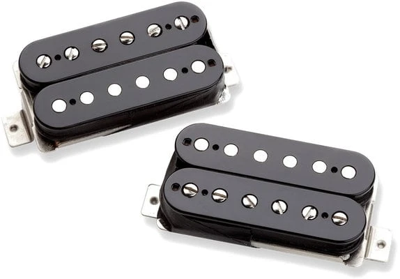 Set of APH-2s Neck / Bridge humbuckers for six string guitars. These pickups are the Slash Signature Model humbuckers. It uses a different mag wire and winding spec, that, when combined with the alnico 2 bar magnet, provided exactly what was needed to push a stock Singlecut toward that familiar sustain, crunch, and midrange that was so characteristic of the tone of Slash’s original Derrig Singlecut copy. The Slash humbucker set is hand built in Santa Barbara the same way his originals were built in the 80s, using a nickel silver bottom plate with long mounting legs, single conductor braided lead wire, maple spacer, paper tape, and wax potting. – Neck PU DC resistance: 7,92 kOhm – Bridge PU DC resistance: 8,53 kOhm – Number of Conductors: 1 – Colour: Black.