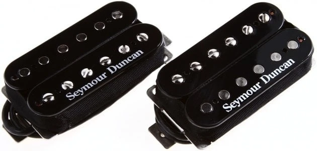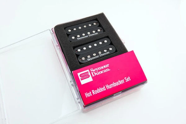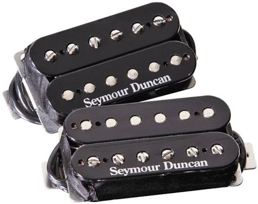 Set of two high-output humbuckers for neck and bridge positions that contains an SH-4 JB for the bridge and SH-2n Jazz model for the neck – classic, incredibly versatile humbucker combination that was created in England in 1974, suitable for every genre from blues and country to hard rock and metal. The SH-4 JB model is one of the most popular Seymour Duncan pickup of all time, and adds juice and versatility to the bridge position. It features hot coils and alnico 5 bar magnet to deliver an unmistakable upper midrange attack, a tight, articulate low end, and harmonically rich highs. The SH-2n Jazz model humbucker also uses an alnico 5 bar magnet and a special coil wind for an articulate, glass treble response that balances very well with its full, but tight low end, and the scooped midrange gives it a smooth tonal character. This model was originally designed as the matching neck pickup for the JB model bridge pickup but is also suitable for almost any moderate to high-output bridge humbucker. Both humbuckers are hand built and use nickel-silver bottom plate, 4-conductor lead wire for multiple wiring options, and are vacuum wax potted for squeal-free performance. Black colour.