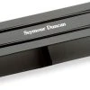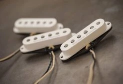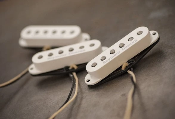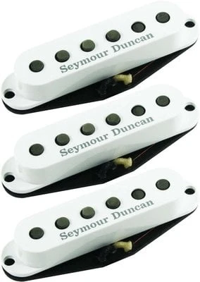 Authentic period correct single coil pickup set that contains three Vintage Staggered for Stratocaster pickups, delivering all the chime and bell tone enjoyed by Stratocaster players in the 50s. The pickups use hand ground alnico 5 rod magnets and heavy Formvar magnetic wire with a special wind pattern to produce that bright, glassy, bell tone with all of the bounce and sparkle that can be expected from the best 50s Strat pickups. The treble attack is crisp and immediate, while the low end remains articulate and focused. Chords ring out with clear note to note separation. This three pickup set includes a standard wound neck pickup, an RWRP, reverse wind reverse polarity, middle pickup for clucky in-between tones, and a slightly over-wound bridge pickup for easier pickup balance. Since 1978, Seymour Duncan has been building all vintage Fender style single coil pickups with the right colour and thickness of Forbon flatwork, along with the period correct magnet stagger. Each pickup comes complete with waxed and tinned cloth pushback hook-up wires and traditional keyed bottom plate. The flatwork is hand filed and the bobbin is assembled and lacquered just as it was done during Fenders Golden Age. Each of the pickups is potted in the wax formulation for squeal free performance and has white cover.
