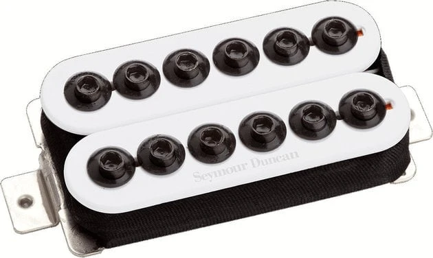 Bridge humbucker pickup for electric guitar from Seymour Duncan. High output with a huge sound, this unique humbucker has a look and sound like no other pickup. Loud, vicious, and unapologetic. Installing an Invader changes your guitar’s DNA. No matter how dangerous your stock pickup claims to be, the Invader will transform any guitar into the mean, heavy-sounding beast you always knew it could be. The Invader’s power comes from the combination of specially overwound coils and three large ceramic magnets, along with its striking oversized metal oxide pole pieces. These expand the overall magnetic field and widen the frequency spectrum, which is why every note played through an Invader sounds so rich. It delivers the thickest and deepest, low end response of any passive pickup we make. Chords sound full and almost subsonic with lower tunings, and balance nicely with the crunchy treble that keeps everything well defined. Match with the Invader neck model for a massive-sounding high-output setup. Hand built in our Santa Barbara, CA factory, the Invader uses a three large ceramic bar magnets, oversized metal oxide poles, nickel silver bottom plate, 4-conductor lead wire for multiple wiring options, and is vacuum wax potted for squeal-free performance.