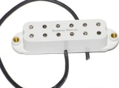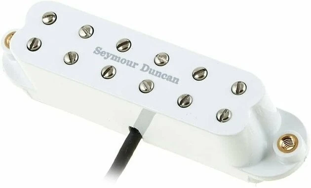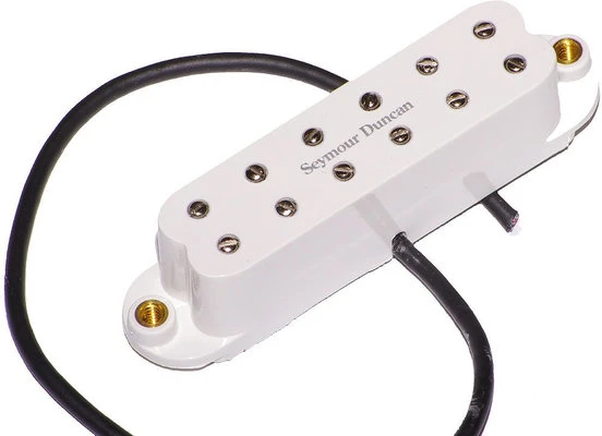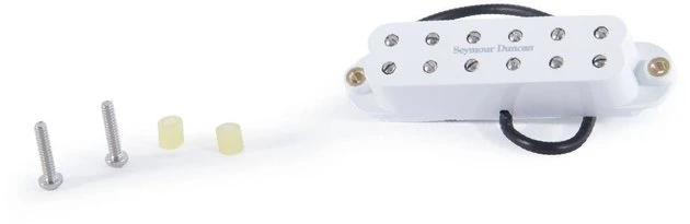 High output single coil sized humbucker for Stratocaster guitar that delivers all the upper midrange harmonics and power to breathe new life into the bridge position. This legendary Seymour Duncan JB pickup model in a single coil size provides nice crunchy chords, and screaming lead tone with that classic upper midrange cut. There are tons of bright harmonic sparkle, and a tight focused low end. The 4-conductor lead wire provides an access to parallel and split wiring options for added versatility. This pickup is a drop-in for any single coil pickup route and is hand built in Santa Barbara. It comes with a ceramic magnet, 4-conductor lead wire for multiple wiring options, and is wax potted for squeal free operation. White cover.