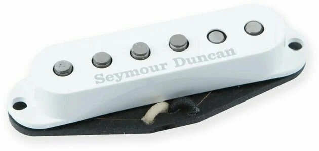 Single-coil pickup for Stratocaster electric guitar that is built exactly like in the old days for all the chime and bell tone enjoyed by Stratocaster players in the 50s. It uses hand ground alnico 5 rod magnets and heavy Formvar magnet wire with a special wind pattern to produce that bright, glassy, bell tone with all of the bounce and sparkle expected from the best 50s Strat pickups. The treble attack is crisp and immediate, while the low end remains articulate and focused. Chords ring out with clear note to note separation. This pickup can be used in the neck or middle position with the Seymour Duncan Custom Staggered pickup in the bridge position for a more rocking setup. Since 1978, Seymour Duncan has been building all of their vintage Fender style single coil pickups just as it was done in Fenders Golden age, starting with the right colour and thickness of Forbon flatwork, with the traditional keyed bottom plate. Then they hand file the flatwork, assemble with hand ground magnets, and lacquer the bobbin. After winding, each pickup is wax potted to reduce unwanted squeal, and comes with waxed and tinned cloth pushback hook-up wires and traditional keyed bottom plate.