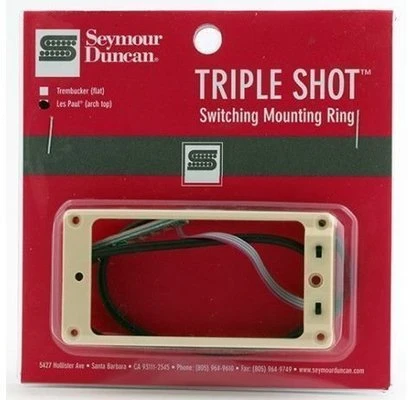 TS-2b Pickup frame – for Humbuckers/Les Paul (carved top) mountain ring for (Electric Guitar) pickups, bridge position with 2 integrated switches to access series, parallel and split wirings. a body-milling is not required colour: cream Expand your tonal palette by accessing three unique tones from a humbucker, thanks to this mounting ring that holds two small switches. This “stealth” pickup switching device allows you to access series, parallel and split wirings with a standard humbucker. And it’s easy to install. Just solder your pickup leads to a small color-coded circuit board – that’s it. Push the two switches towards each other for standard series wiring; away from each other for parallel wiring; and both towards one coil (either one) to shut that coil off. For use with nearly any humbucker pickups (E-Guitar) with 4-conductor cable: Seymour Duncan or otherwise. Available in black and cream, single or in a set (neck/bridge).The TS Triple Shot Mounting Ring is available as TS-1 for Trembuckers (flat top), oder als TS-2 for Humbuckers (for Les Paul; carved top).