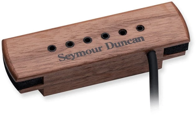 The Woody XL is a passive, noiseless, magnetic soundhole pickup with adjustable pole pieces that delivers a full spectrum acoustic tone that is great for everything from jangly strumming, to quiet fingerstyle playing. It gives you a great balance that combines the fat bottom of the HC version, with the sparkly top end of the SC version all with no 60-cycle hum. The individually adjustable pole pieces enable you to really fine tune your sting to string balance. All of the Woodys are available in our custom maple, walnut or black stained housing, and are double potted to keep them resistant to feedback. It mounts instantly into your soundhole, with no modification of any kind needed to the guitar and can easily be removed at a moments notice. It comes with a 14-foot low capacitance, studio quality cable that will plug directly into your favorite amp, PA, direct box, or console. Fits all standard soundholes (3.75 (94mm) to 4.0 (100mm). Great for all standard types of steel string acoustic guitars. NOTE this is a magnetic pickup, and will not work with nylon stringed instruments. Walnut.