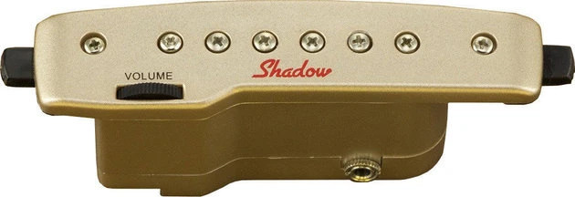 Active Soundhole Humbucker w/Volume Control. Perfectly Balanced Output, Completely Shielded, Zero Hum, Includes CR2032 battery, Includes high-quality stereo endpin 1/4” output (SH 009) for permanent installation, Includes separate output cable 12’ (SH 007) for temporary installation. The award-winning Shadow SH 145 Prestige acoustic guitar pickup is designed to give a truly authentic, crisp, and natural acoustic guitar sound. Using powerful samarium cobalt magnets, the SH 145 is built as a stacked humbucker with trimmed adjustable pole pieces to provide perfect string balance for acoustic guitar strings. A completely shielded case and low impedance output make it 100% hum-free. Electronic circuitry is powered by a single 3V cell battery with extremely low power consumption. Volume control and easy installation make the SH 145 Prestige pickup one of the most user-friendly on the market. An end pin connection cable for permanent installation and a detachable quick mount 12′ (4m) cable are included. Gold Finish