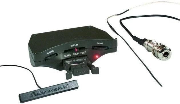 Hybrid Active preamp for Acoustic Guitar, Nanoflex and NanoMAG pickup/preamp combo for steel string guitar. Nanoflex pickups not only respond to string vibrations, but also sense the vibrations of the body of the instrument simultaneously. This completed shielded system incorporates active amplification in the pickup itself, which makes it 100% hum and noise free. NanoMAG pickups are low-impedance active mini-humbuckers made with Samarium Cobalt magnets. These innovative Shadow pickups are balanced for both acoustic and electric guitar strings and have a much larger frequency range than your typical midrange-heavy humbucker. The SH SONIC DP is an easy-to-install pickup system that houses its preamp elegantly in the endpin jack, which means no cutting into the side of the guitar. The volume and tone controls are mounted discreetly inside the sound hole along with the 9V battery pack/holder.